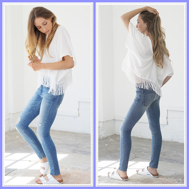 Look casual básico para trabalho e faculdade, da americana Christen Gerhart , jeans skinny combinando com a blusa tipo túnica com franjas, bem estilosa. O blogue dela é o www.christengerhart.com
