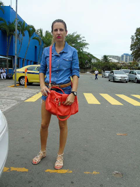 Jeans e jeans, short e blusa, num look bem casual do dia a dia, preparando para o findi. Sendo o ponto alto a bolsa laranja que da um up no conjunto, nos pés, rasteira com spike. Aproveite o Fim de semana.😘